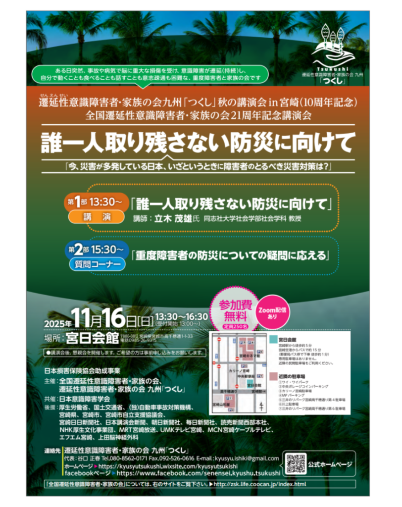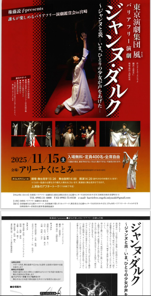 情報提供です。 1. 誰もが楽しめるバリアフリー演劇鑑賞会 ジャンヌ・ダルク ジャンヌと炎―いま、ひとりの少女が声をあげた- アリーナくにとみ 東諸県郡国富町大字本庄11895 11月15日(土)13:20開場・舞台見学 14:20開演 2. 遷延性意識障害者・家族の会「つくし」講演会 誰一人取り残さない防災に向けて 今、災害が多発している日本、いざというときに 障害者のとるべき災害対策は? 講師:立木茂雄先生 同志社大学社会学部社会学科教授 福祉防災学 11月16日(日)13:30~16:30(受付開始13:00) 宮日会館 11階 宮日ホール ※両方とも参加費無料ですが、事前申し込みが必要です。 2週間後の連日の行事紹介です。 詳しくは添付したチラシをご覧ください。 まだまだ空きがあります。 両方とも非常に興味深い内容ですので、お時間のある方は是非足を運んでください。 特定非営利活動法人 障害者自立応援センターYAH!DOみやざき 理事 永山 昌彦